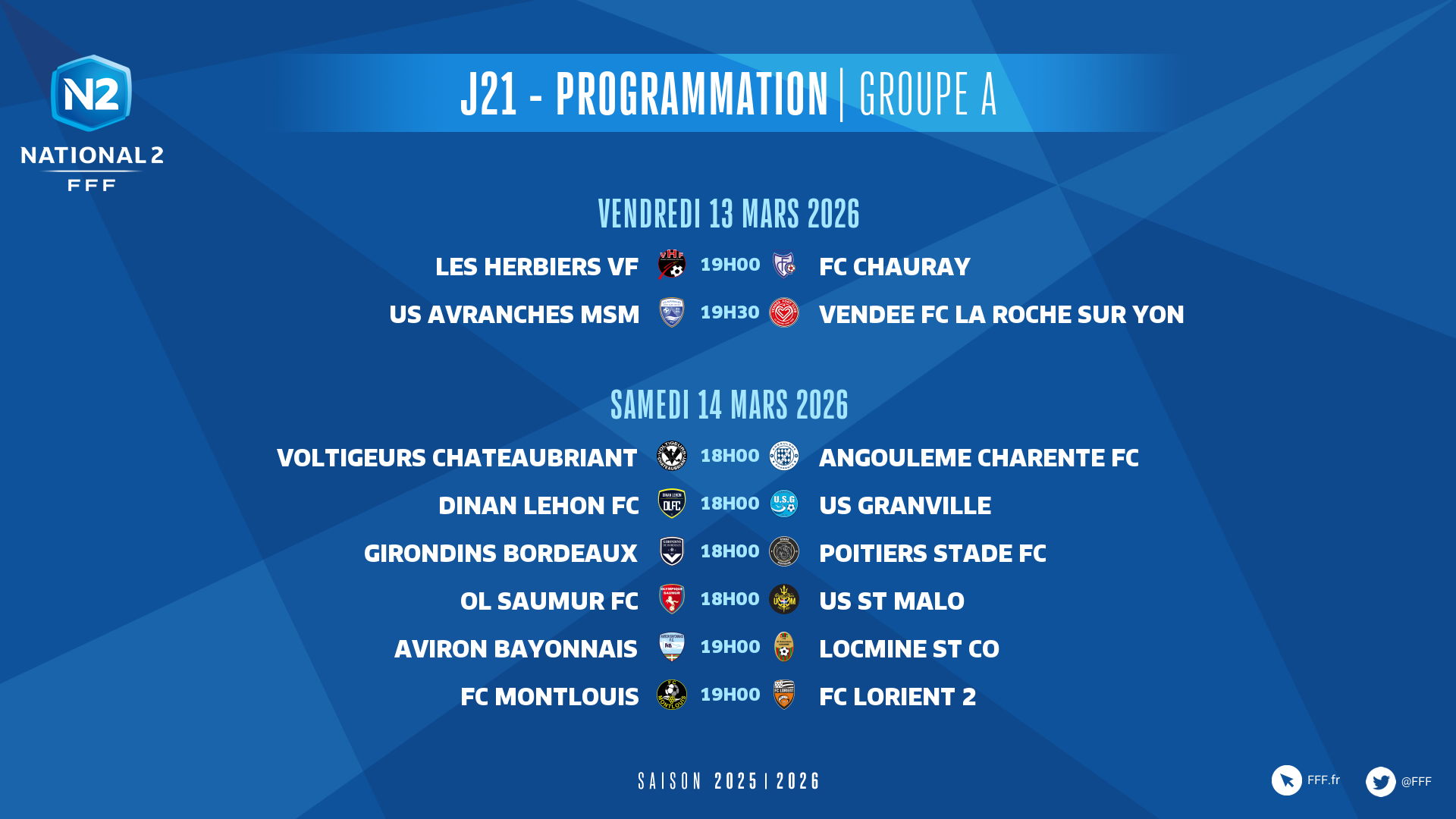 - 19h00 : Les Herbiers VF (6e, 29 pts) - FC Chauray (15e, 19 pts)