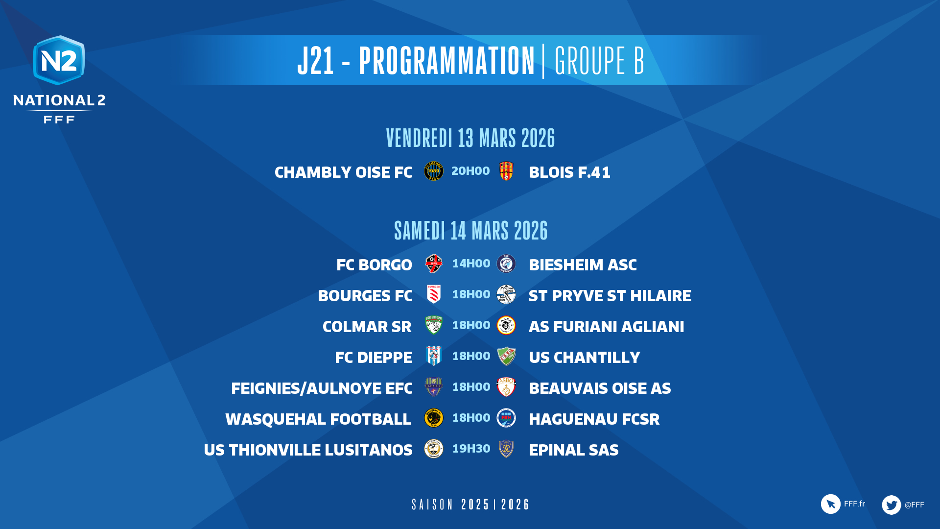 - 20h00 : Chambly Oise FC (15e, 17 pts) - Blois Foot 41 (16e, 13 pts)