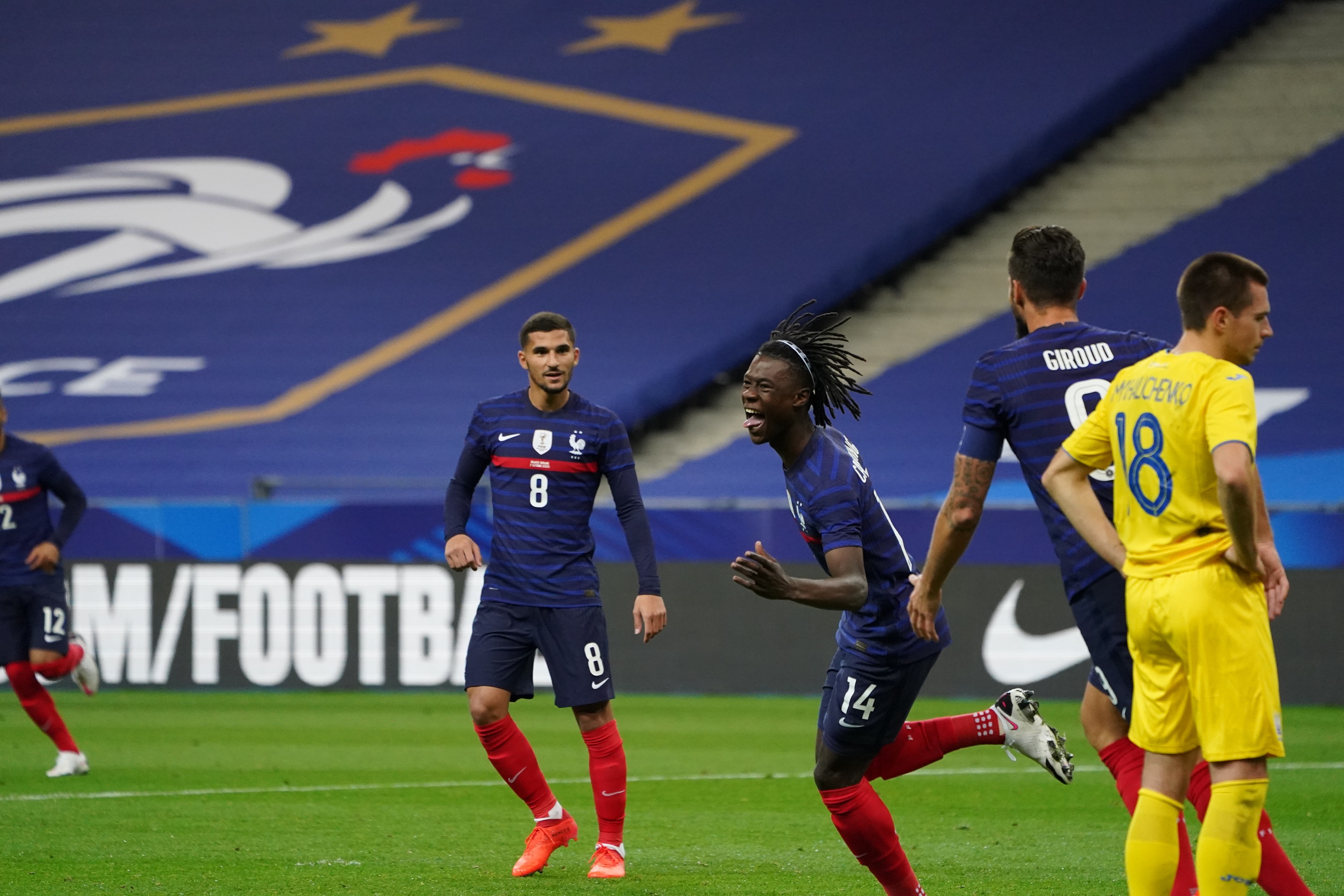 Sous le regard d'Housem Aouar, Eduardo Camavinga célèbre son premier but en A lors de France-Ukraine (7-1), en octobre 2020 (photo Simon MORCEL / FFF).