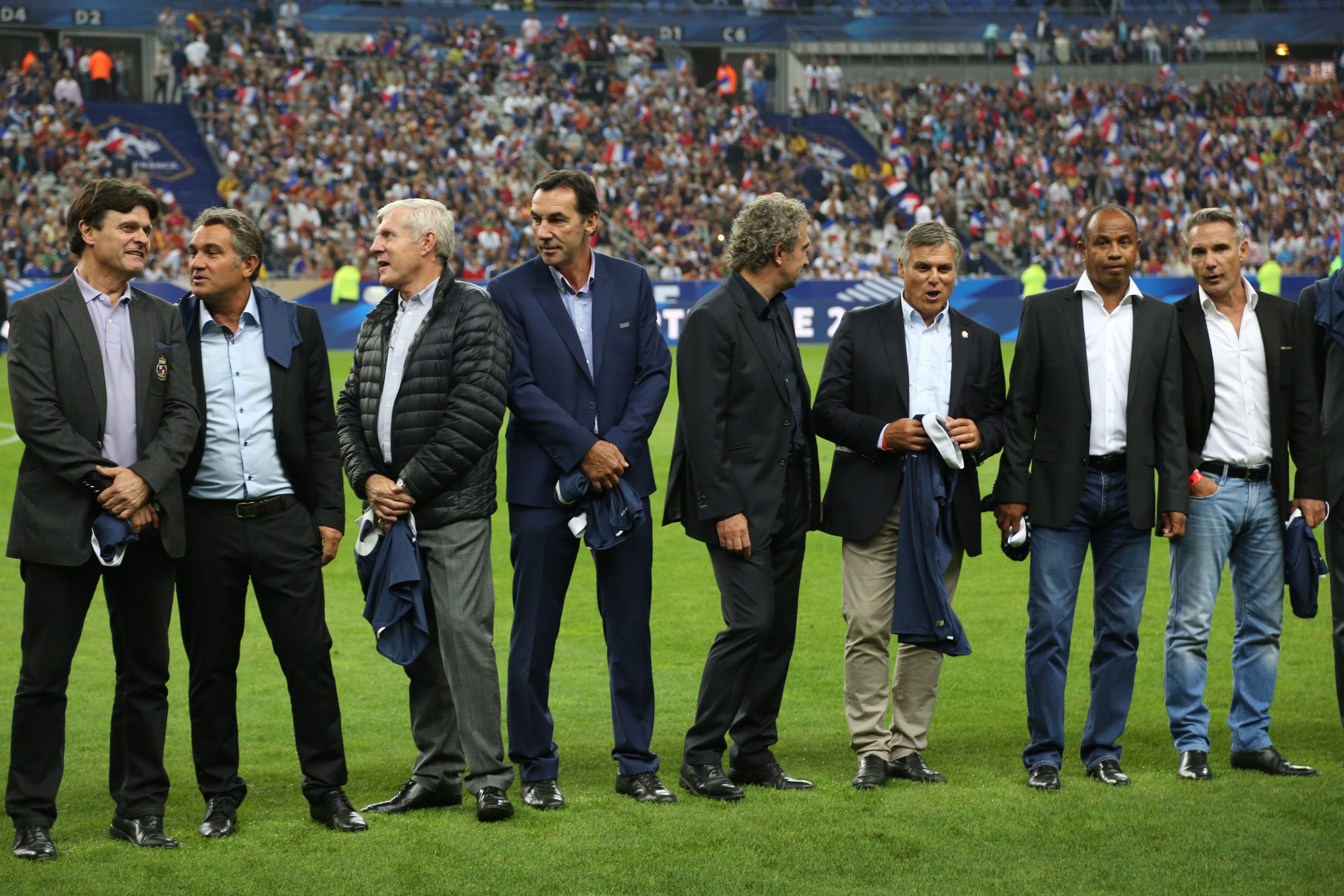 4 septembre 2014 : trente ans après leur titre européen, les Bleus "1984" reçoivent l'hommage du Stade de France avant un match amical contre l'Espagne. De gauche à droite : Six, Ferreri, Fernandez, Bossis, Rocheteau, Tigana, Amoros, Bellone (photo FFF).