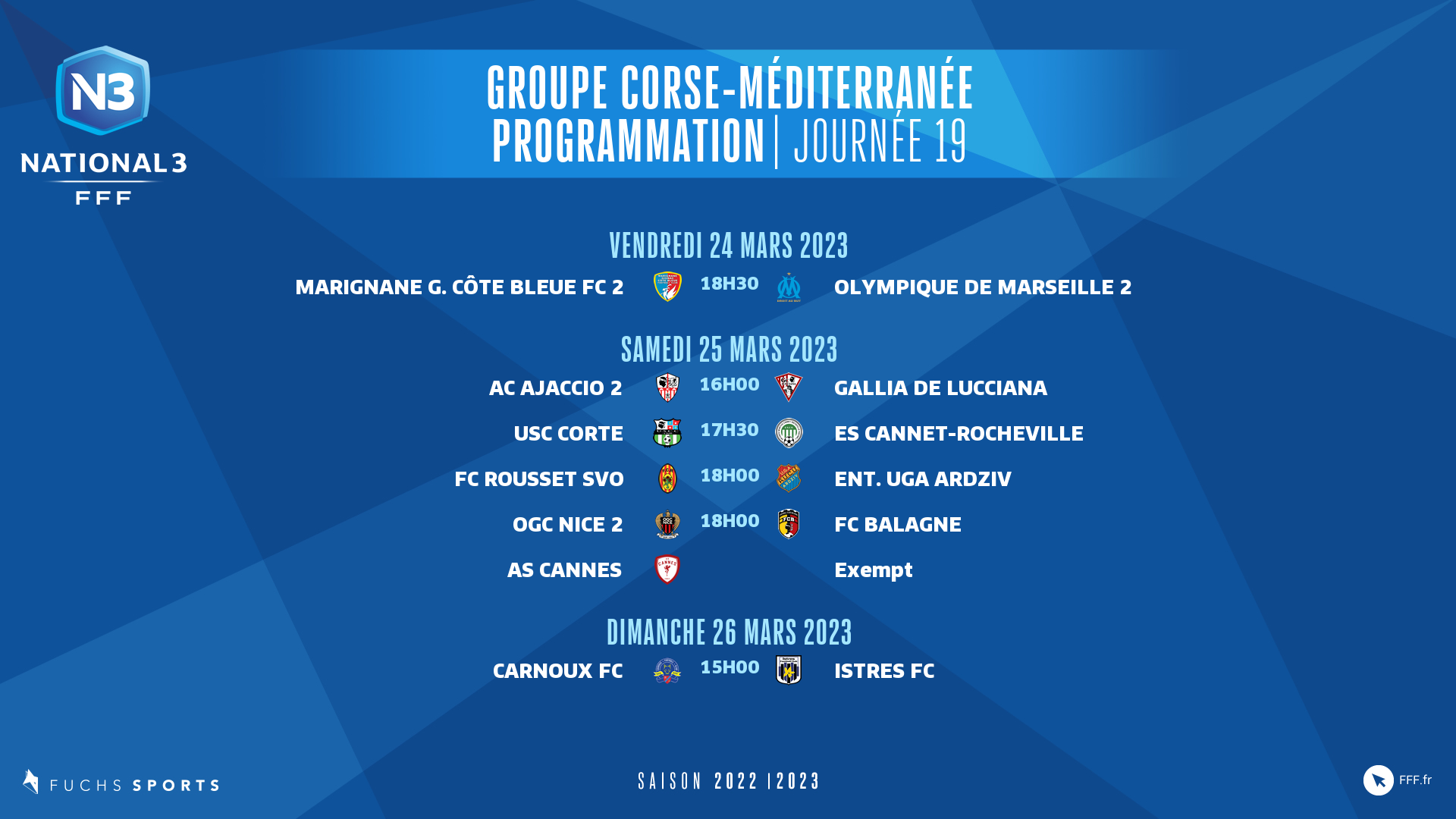 La FFF a dévoilé la programmation de la 19ème journée de la poule Corse-Méditerranée du championnat de National 3. Celle-ci s'étalera sur trois jours.